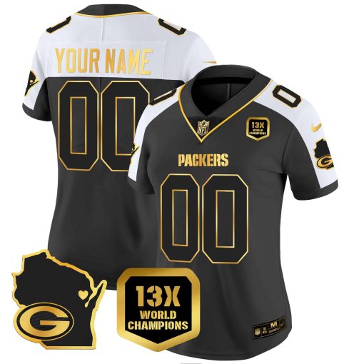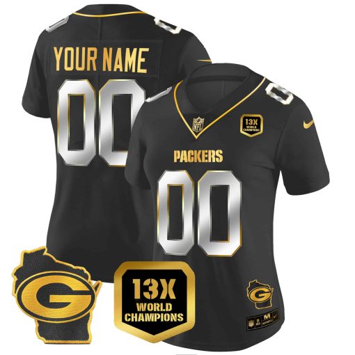 Packers 13 Time World Champions & Home Patch Gold Vapor Jersey V2 – All Stitched
